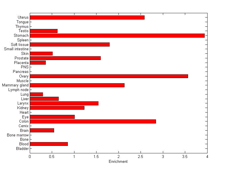 The expression level is normalized with tissue-library size. Each value for a gene in a tissue is a ratio of observed ESTs to the expected one in this tissue. The expected number of ESTs is the product of total ESTs of the gene and the fraction of total ESTs in the tissue among all ESTs in 30 tissues.