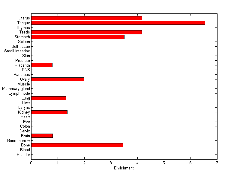The expression level is normalized with tissue-library size. Each value for a gene in a tissue is a ratio of observed ESTs to the expected one in this tissue. The expected number of ESTs is the product of total ESTs of the gene and the fraction of total ESTs in the tissue among all ESTs in 30 tissues.