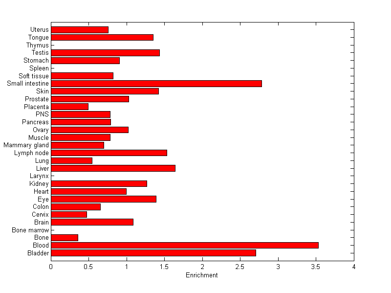 The expression level is normalized with tissue-library size. Each value for a gene in a tissue is a ratio of observed ESTs to the expected one in this tissue. The expected number of ESTs is the product of total ESTs of the gene and the fraction of total ESTs in the tissue among all ESTs in 30 tissues.