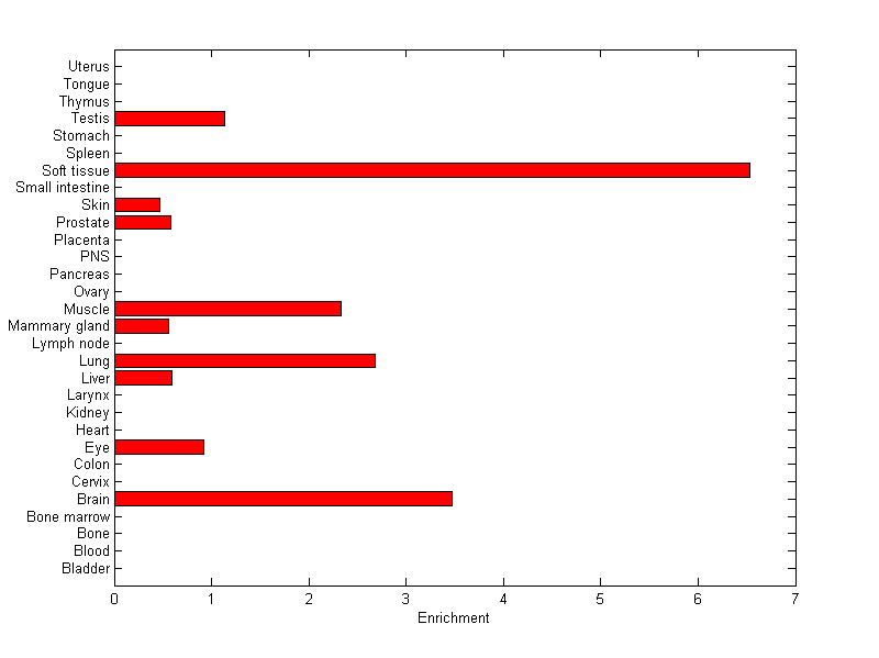 The expression level is normalized with tissue-library size. Each value for a gene in a tissue is a ratio of observed ESTs to the expected one in this tissue. The expected number of ESTs is the product of total ESTs of the gene and the fraction of total ESTs in the tissue among all ESTs in 30 tissues.