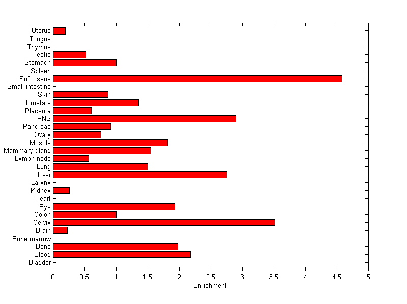 The expression level is normalized with tissue-library size. Each value for a gene in a tissue is a ratio of observed ESTs to the expected one in this tissue. The expected number of ESTs is the product of total ESTs of the gene and the fraction of total ESTs in the tissue among all ESTs in 30 tissues.