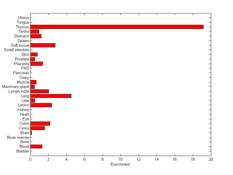 The expression level is normalized with tissue-library size. Each value for a gene in a tissue is a ratio of observed ESTs to the expected one in this tissue. The expected number of ESTs is the product of total ESTs of the gene and the fraction of total ESTs in the tissue among all ESTs in 30 tissues.
