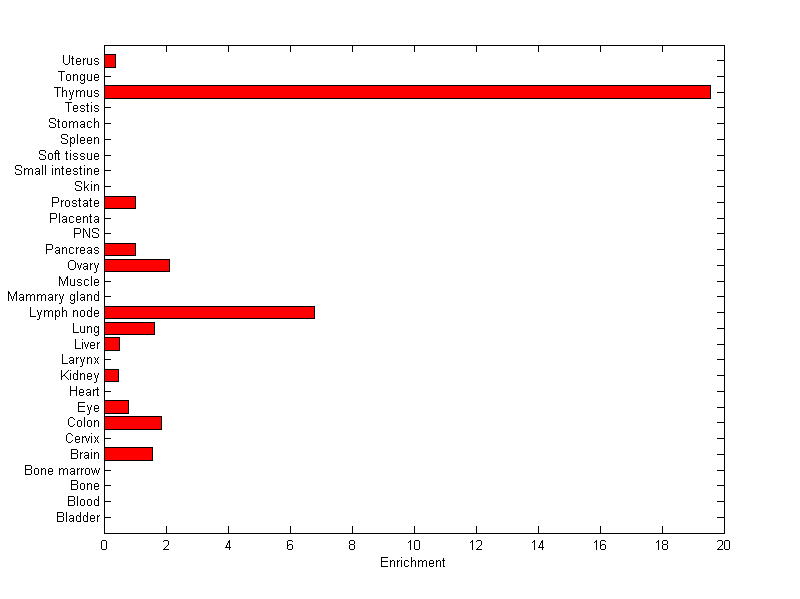 The expression level is normalized with tissue-library size. Each value for a gene in a tissue is a ratio of observed ESTs to the expected one in this tissue. The expected number of ESTs is the product of total ESTs of the gene and the fraction of total ESTs in the tissue among all ESTs in 30 tissues.