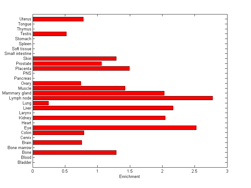 The expression level is normalized with tissue-library size. Each value for a gene in a tissue is a ratio of observed ESTs to the expected one in this tissue. The expected number of ESTs is the product of total ESTs of the gene and the fraction of total ESTs in the tissue among all ESTs in 30 tissues.