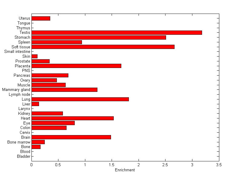 The expression level is normalized with tissue-library size. Each value for a gene in a tissue is a ratio of observed ESTs to the expected one in this tissue. The expected number of ESTs is the product of total ESTs of the gene and the fraction of total ESTs in the tissue among all ESTs in 30 tissues.