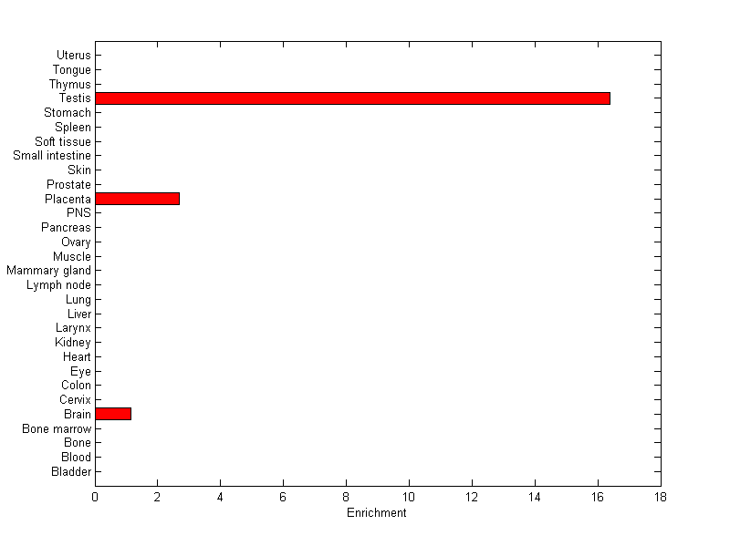 The expression level is normalized with tissue-library size. Each value for a gene in a tissue is a ratio of observed ESTs to the expected one in this tissue. The expected number of ESTs is the product of total ESTs of the gene and the fraction of total ESTs in the tissue among all ESTs in 30 tissues.