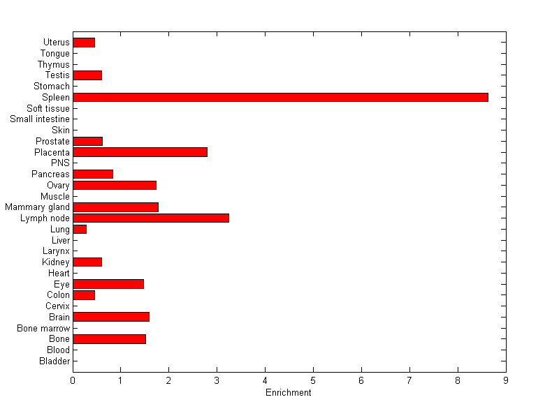 The expression level is normalized with tissue-library size. Each value for a gene in a tissue is a ratio of observed ESTs to the expected one in this tissue. The expected number of ESTs is the product of total ESTs of the gene and the fraction of total ESTs in the tissue among all ESTs in 30 tissues.