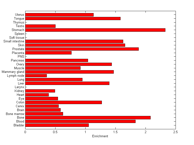 The expression level is normalized with tissue-library size. Each value for a gene in a tissue is a ratio of observed ESTs to the expected one in this tissue. The expected number of ESTs is the product of total ESTs of the gene and the fraction of total ESTs in the tissue among all ESTs in 30 tissues.