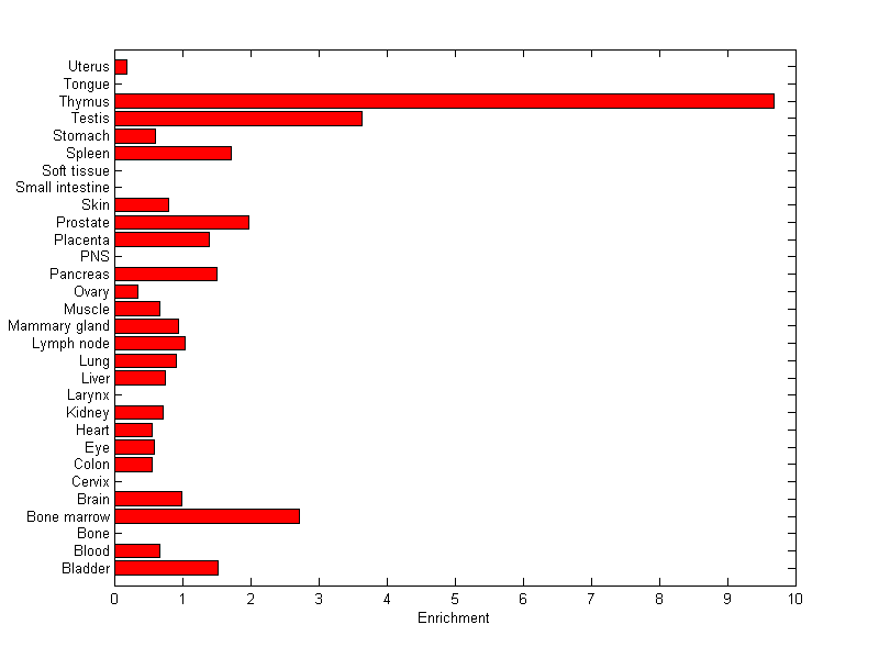The expression level is normalized with tissue-library size. Each value for a gene in a tissue is a ratio of observed ESTs to the expected one in this tissue. The expected number of ESTs is the product of total ESTs of the gene and the fraction of total ESTs in the tissue among all ESTs in 30 tissues.