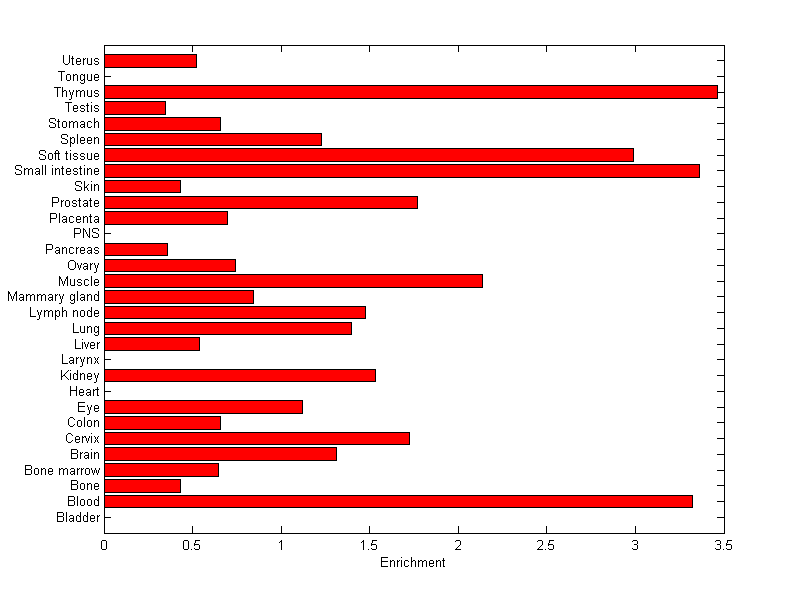The expression level is normalized with tissue-library size. Each value for a gene in a tissue is a ratio of observed ESTs to the expected one in this tissue. The expected number of ESTs is the product of total ESTs of the gene and the fraction of total ESTs in the tissue among all ESTs in 30 tissues.