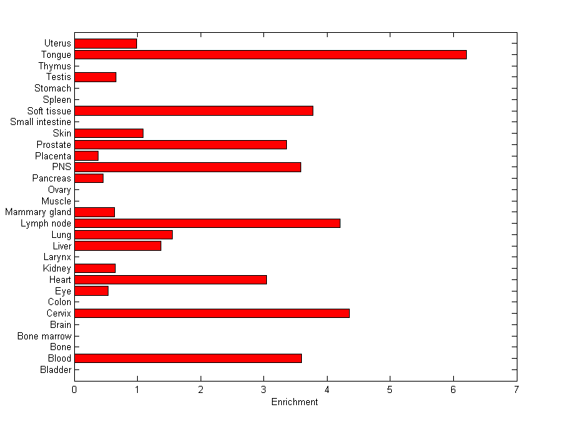 The expression level is normalized with tissue-library size. Each value for a gene in a tissue is a ratio of observed ESTs to the expected one in this tissue. The expected number of ESTs is the product of total ESTs of the gene and the fraction of total ESTs in the tissue among all ESTs in 30 tissues.