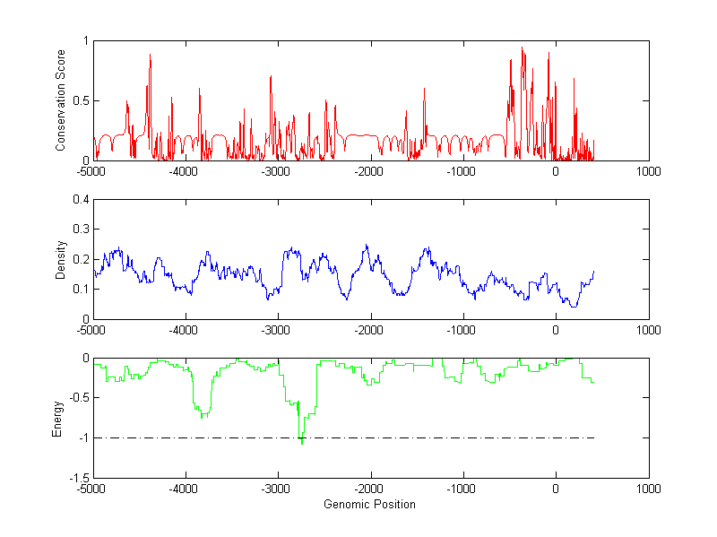 The energy profile (green curve) is about energy for module detection based on TF interaction. The positions with energy less than -1 indicate the existence of CRMs.