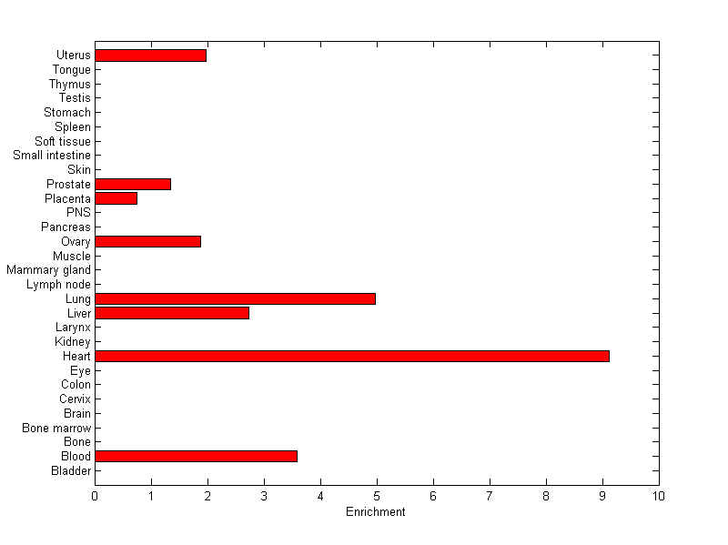 The expression level is normalized with tissue-library size. Each value for a gene in a tissue is a ratio of observed ESTs to the expected one in this tissue. The expected number of ESTs is the product of total ESTs of the gene and the fraction of total ESTs in the tissue among all ESTs in 30 tissues.