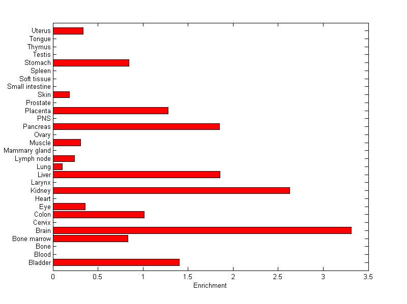 The expression level is normalized with tissue-library size. Each value for a gene in a tissue is a ratio of observed ESTs to the expected one in this tissue. The expected number of ESTs is the product of total ESTs of the gene and the fraction of total ESTs in the tissue among all ESTs in 30 tissues.