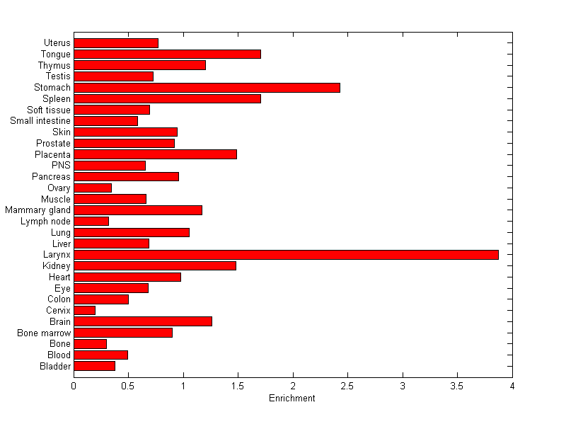 The expression level is normalized with tissue-library size. Each value for a gene in a tissue is a ratio of observed ESTs to the expected one in this tissue. The expected number of ESTs is the product of total ESTs of the gene and the fraction of total ESTs in the tissue among all ESTs in 30 tissues.