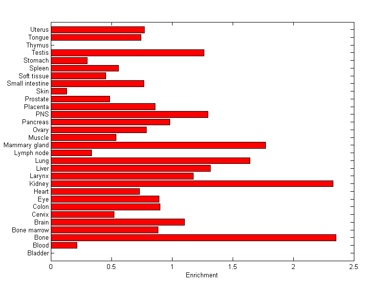The expression level is normalized with tissue-library size. Each value for a gene in a tissue is a ratio of observed ESTs to the expected one in this tissue. The expected number of ESTs is the product of total ESTs of the gene and the fraction of total ESTs in the tissue among all ESTs in 30 tissues.