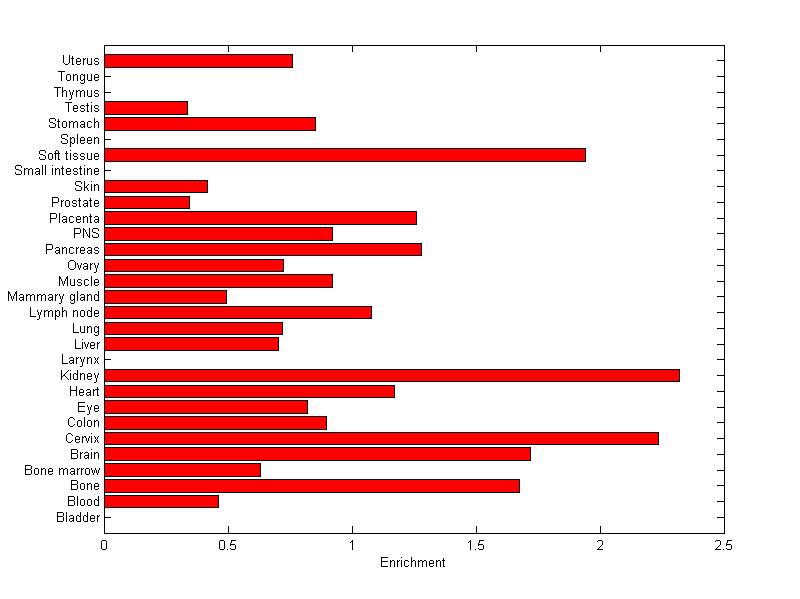 The expression level is normalized with tissue-library size. Each value for a gene in a tissue is a ratio of observed ESTs to the expected one in this tissue. The expected number of ESTs is the product of total ESTs of the gene and the fraction of total ESTs in the tissue among all ESTs in 30 tissues.