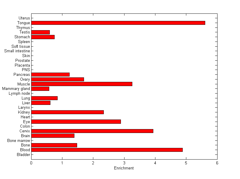 The expression level is normalized with tissue-library size. Each value for a gene in a tissue is a ratio of observed ESTs to the expected one in this tissue. The expected number of ESTs is the product of total ESTs of the gene and the fraction of total ESTs in the tissue among all ESTs in 30 tissues.