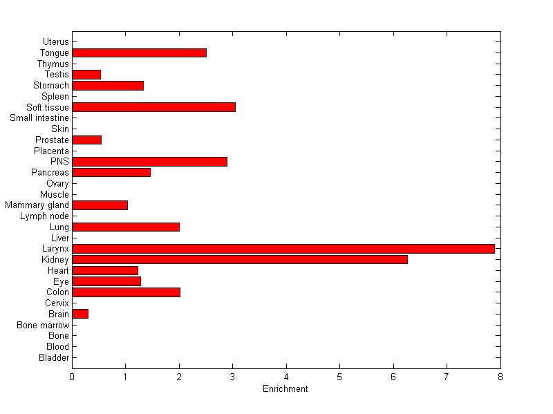 The expression level is normalized with tissue-library size. Each value for a gene in a tissue is a ratio of observed ESTs to the expected one in this tissue. The expected number of ESTs is the product of total ESTs of the gene and the fraction of total ESTs in the tissue among all ESTs in 30 tissues.