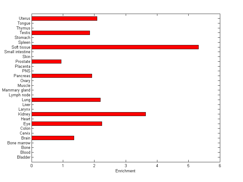 The expression level is normalized with tissue-library size. Each value for a gene in a tissue is a ratio of observed ESTs to the expected one in this tissue. The expected number of ESTs is the product of total ESTs of the gene and the fraction of total ESTs in the tissue among all ESTs in 30 tissues.