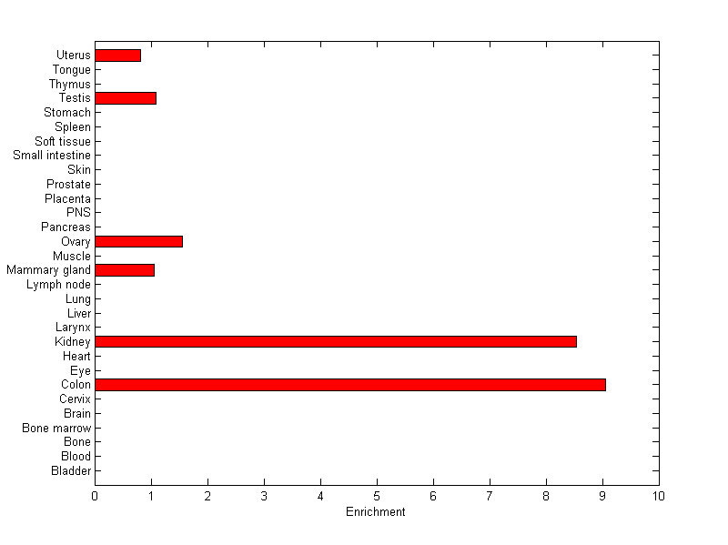 About the profile: The expression level is normalized with tissue-library size. Each value for a gene in a tissue is a ratio of observed ESTs to the expected one in this tissue. The expected number of ESTs is the product of total ESTs of the gene and the fraction of total ESTs in the tissue among all ESTs in 30 tissues. Summary: This gene is preferentially expressed in [colon, kidney] Download: |