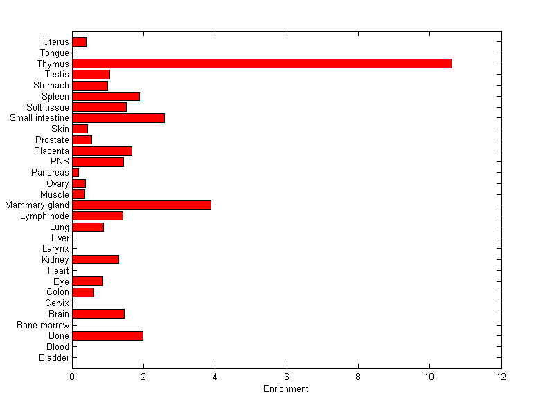 The expression level is normalized with tissue-library size. Each value for a gene in a tissue is a ratio of observed ESTs to the expected one in this tissue. The expected number of ESTs is the product of total ESTs of the gene and the fraction of total ESTs in the tissue among all ESTs in 30 tissues.