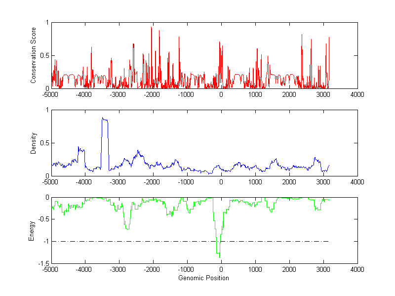 The energy profile (green curve) is about energy for module detection based on TF interaction. The positions with energy less than -1 indicate the existence of CRMs.