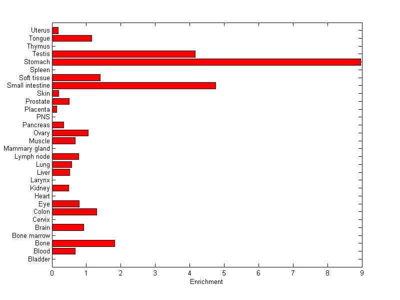 The expression level is normalized with tissue-library size. Each value for a gene in a tissue is a ratio of observed ESTs to the expected one in this tissue. The expected number of ESTs is the product of total ESTs of the gene and the fraction of total ESTs in the tissue among all ESTs in 30 tissues.