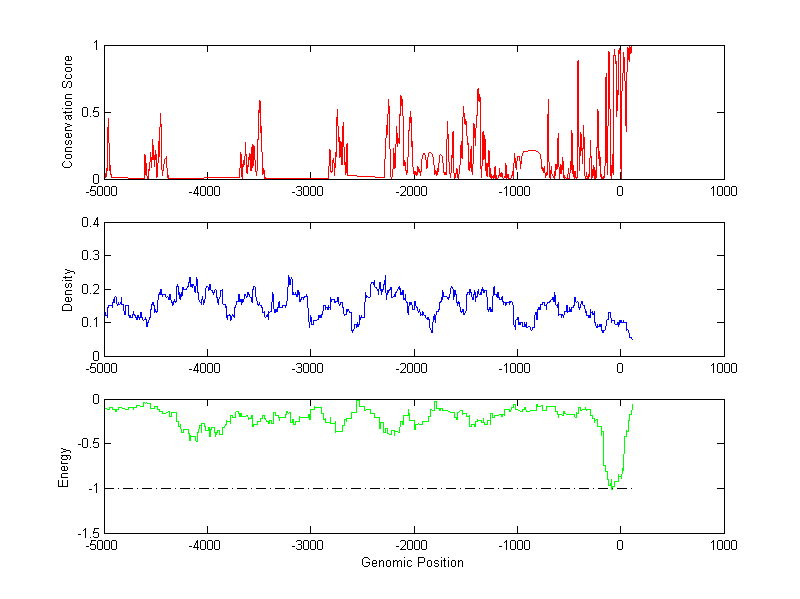The conservation profile (red curve) is about conservation scores of the promoter sequences. Conservation was determined from an eight-way alignment of human, chimpanzee, dog, mouse, rat, chicken, zebrafish and fugu sequences. The conservation was quantified by a conservation score between 0 and 1, with 1 as highest conservation. The conservation score was obtained from UCSC genome databases.