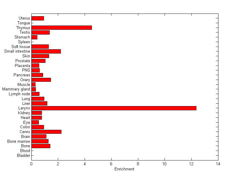 The expression level is normalized with tissue-library size. Each value for a gene in a tissue is a ratio of observed ESTs to the expected one in this tissue. The expected number of ESTs is the product of total ESTs of the gene and the fraction of total ESTs in the tissue among all ESTs in 30 tissues.
