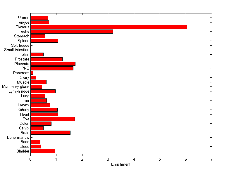 The expression level is normalized with tissue-library size. Each value for a gene in a tissue is a ratio of observed ESTs to the expected one in this tissue. The expected number of ESTs is the product of total ESTs of the gene and the fraction of total ESTs in the tissue among all ESTs in 30 tissues.