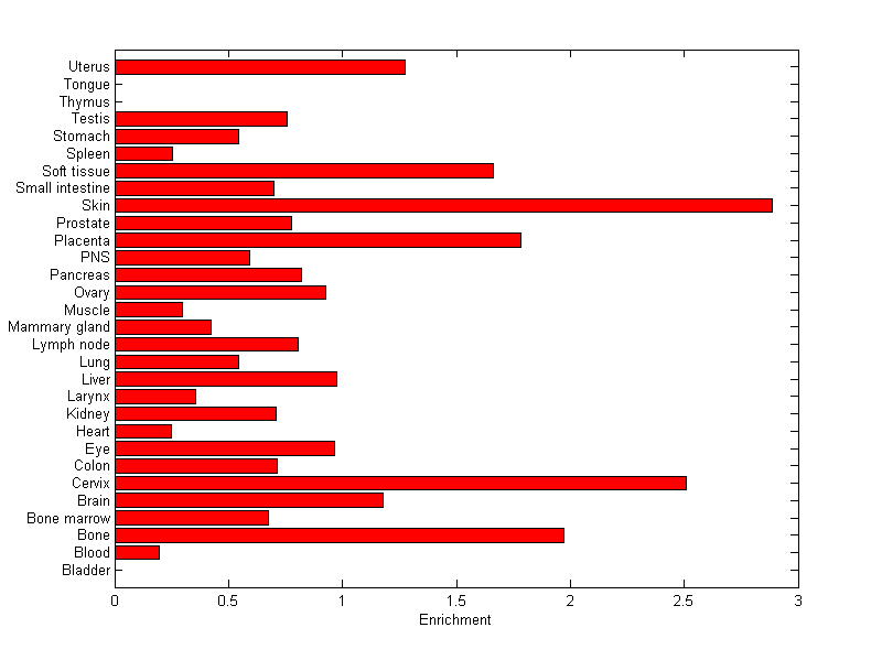 The expression level is normalized with tissue-library size. Each value for a gene in a tissue is a ratio of observed ESTs to the expected one in this tissue. The expected number of ESTs is the product of total ESTs of the gene and the fraction of total ESTs in the tissue among all ESTs in 30 tissues.