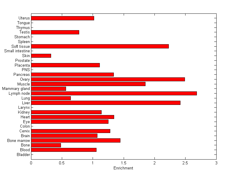 The expression level is normalized with tissue-library size. Each value for a gene in a tissue is a ratio of observed ESTs to the expected one in this tissue. The expected number of ESTs is the product of total ESTs of the gene and the fraction of total ESTs in the tissue among all ESTs in 30 tissues.
