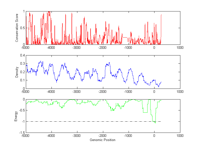 The energy profile (green curve) is about energy for module detection based on TF interaction. The positions with energy less than -1 indicate the existence of CRMs.