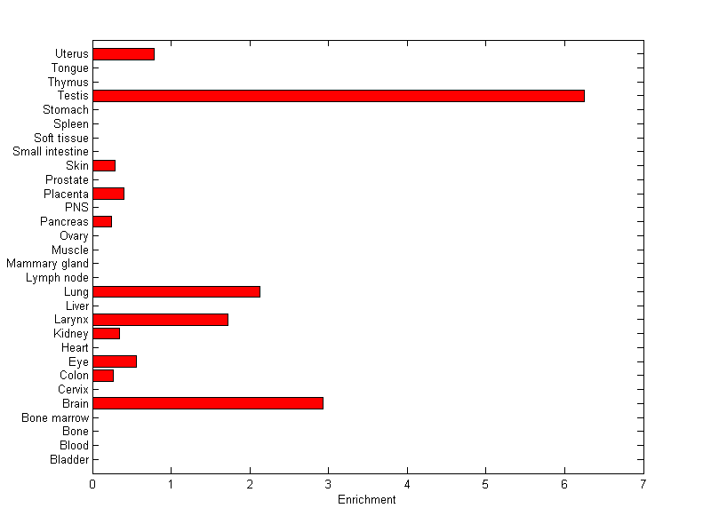 The expression level is normalized with tissue-library size. Each value for a gene in a tissue is a ratio of observed ESTs to the expected one in this tissue. The expected number of ESTs is the product of total ESTs of the gene and the fraction of total ESTs in the tissue among all ESTs in 30 tissues.