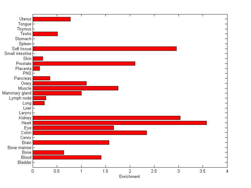The expression level is normalized with tissue-library size. Each value for a gene in a tissue is a ratio of observed ESTs to the expected one in this tissue. The expected number of ESTs is the product of total ESTs of the gene and the fraction of total ESTs in the tissue among all ESTs in 30 tissues.