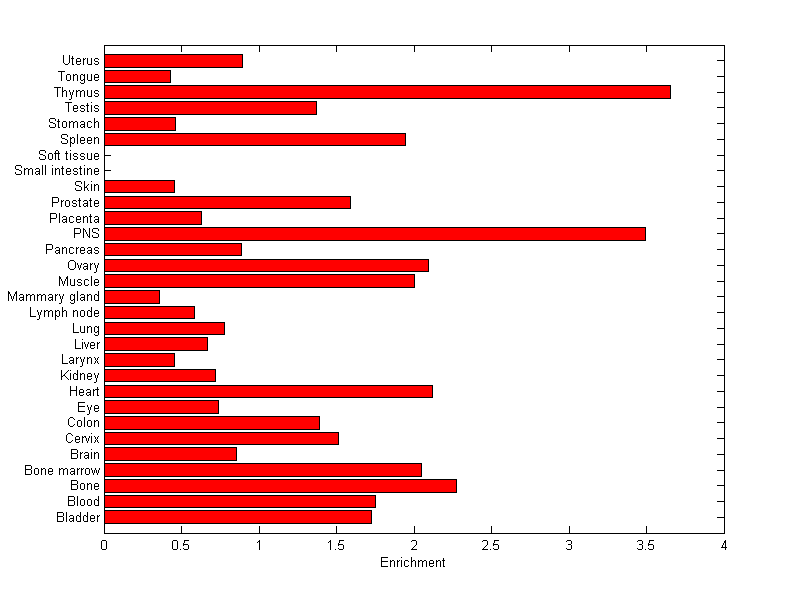The expression level is normalized with tissue-library size. Each value for a gene in a tissue is a ratio of observed ESTs to the expected one in this tissue. The expected number of ESTs is the product of total ESTs of the gene and the fraction of total ESTs in the tissue among all ESTs in 30 tissues.