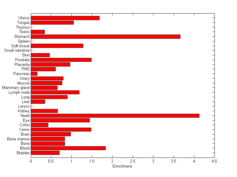 The expression level is normalized with tissue-library size. Each value for a gene in a tissue is a ratio of observed ESTs to the expected one in this tissue. The expected number of ESTs is the product of total ESTs of the gene and the fraction of total ESTs in the tissue among all ESTs in 30 tissues.