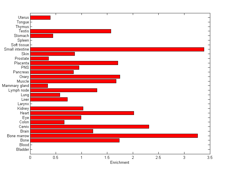 The expression level is normalized with tissue-library size. Each value for a gene in a tissue is a ratio of observed ESTs to the expected one in this tissue. The expected number of ESTs is the product of total ESTs of the gene and the fraction of total ESTs in the tissue among all ESTs in 30 tissues.