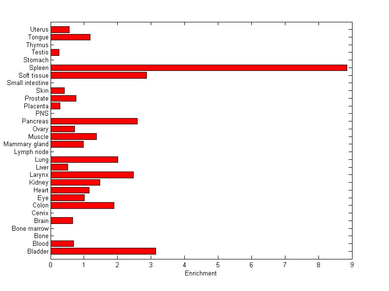 About the profile: The expression level is normalized with tissue-library size. Each value for a gene in a tissue is a ratio of observed ESTs to the expected one in this tissue. The expected number of ESTs is the product of total ESTs of the gene and the fraction of total ESTs in the tissue among all ESTs in 30 tissues. Summary: This gene is preferentially expressed in [spleen] Download: |