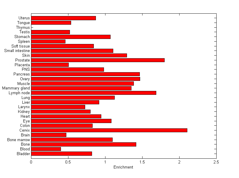 The expression level is normalized with tissue-library size. Each value for a gene in a tissue is a ratio of observed ESTs to the expected one in this tissue. The expected number of ESTs is the product of total ESTs of the gene and the fraction of total ESTs in the tissue among all ESTs in 30 tissues.