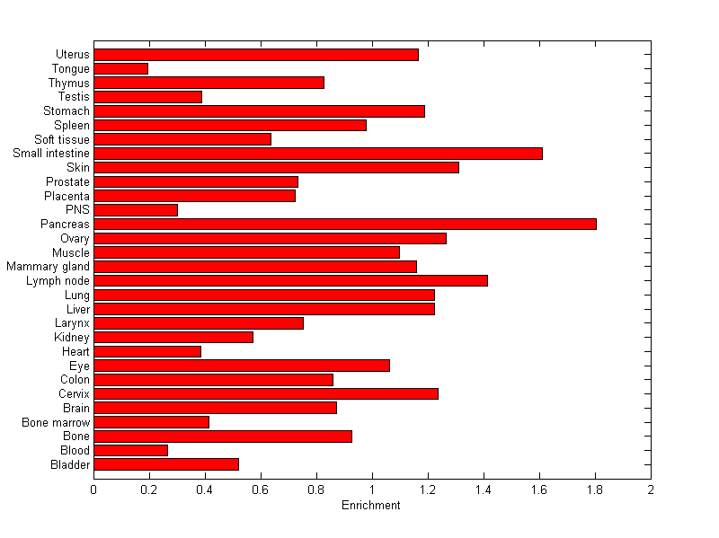 The expression level is normalized with tissue-library size. Each value for a gene in a tissue is a ratio of observed ESTs to the expected one in this tissue. The expected number of ESTs is the product of total ESTs of the gene and the fraction of total ESTs in the tissue among all ESTs in 30 tissues.