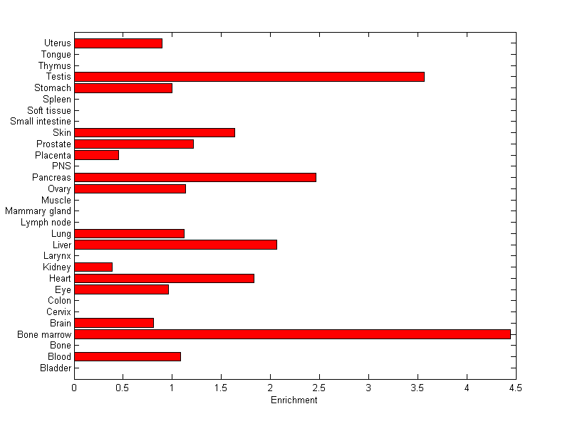 The expression level is normalized with tissue-library size. Each value for a gene in a tissue is a ratio of observed ESTs to the expected one in this tissue. The expected number of ESTs is the product of total ESTs of the gene and the fraction of total ESTs in the tissue among all ESTs in 30 tissues.