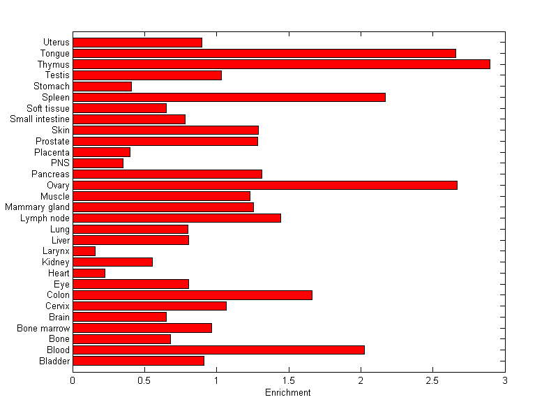 The expression level is normalized with tissue-library size. Each value for a gene in a tissue is a ratio of observed ESTs to the expected one in this tissue. The expected number of ESTs is the product of total ESTs of the gene and the fraction of total ESTs in the tissue among all ESTs in 30 tissues.
