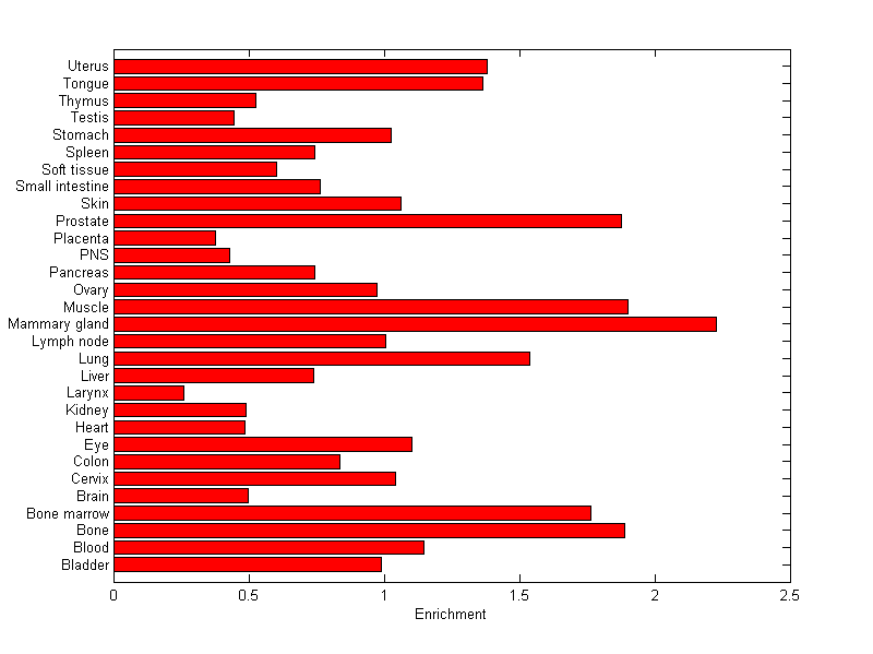 The expression level is normalized with tissue-library size. Each value for a gene in a tissue is a ratio of observed ESTs to the expected one in this tissue. The expected number of ESTs is the product of total ESTs of the gene and the fraction of total ESTs in the tissue among all ESTs in 30 tissues.