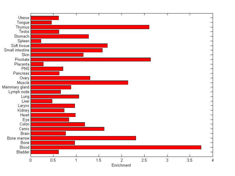The expression level is normalized with tissue-library size. Each value for a gene in a tissue is a ratio of observed ESTs to the expected one in this tissue. The expected number of ESTs is the product of total ESTs of the gene and the fraction of total ESTs in the tissue among all ESTs in 30 tissues.
