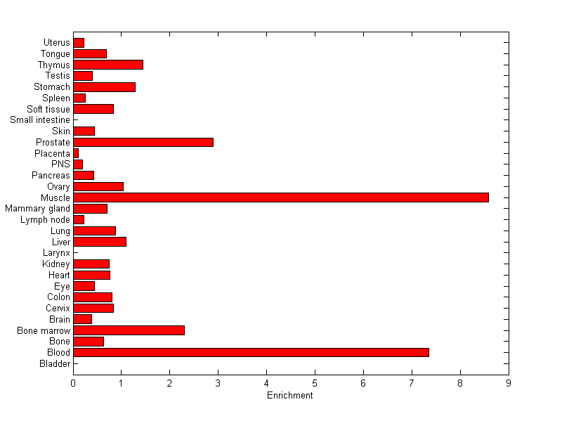 About the profile: The expression level is normalized with tissue-library size. Each value for a gene in a tissue is a ratio of observed ESTs to the expected one in this tissue. The expected number of ESTs is the product of total ESTs of the gene and the fraction of total ESTs in the tissue among all ESTs in 30 tissues. Summary: This gene is preferentially expressed in [blood, muscle] Download: |