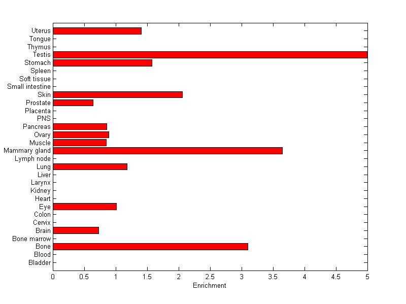 The expression level is normalized with tissue-library size. Each value for a gene in a tissue is a ratio of observed ESTs to the expected one in this tissue. The expected number of ESTs is the product of total ESTs of the gene and the fraction of total ESTs in the tissue among all ESTs in 30 tissues.