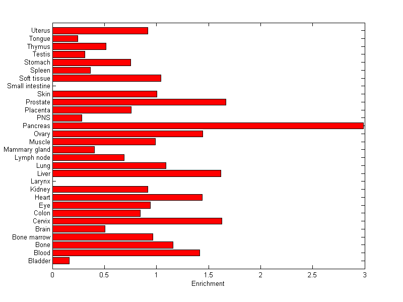 The expression level is normalized with tissue-library size. Each value for a gene in a tissue is a ratio of observed ESTs to the expected one in this tissue. The expected number of ESTs is the product of total ESTs of the gene and the fraction of total ESTs in the tissue among all ESTs in 30 tissues.