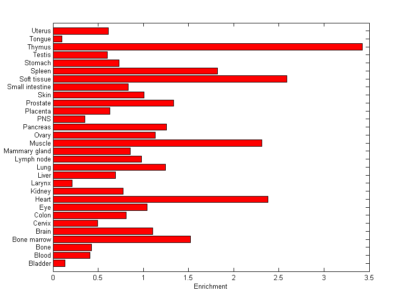 The expression level is normalized with tissue-library size. Each value for a gene in a tissue is a ratio of observed ESTs to the expected one in this tissue. The expected number of ESTs is the product of total ESTs of the gene and the fraction of total ESTs in the tissue among all ESTs in 30 tissues.